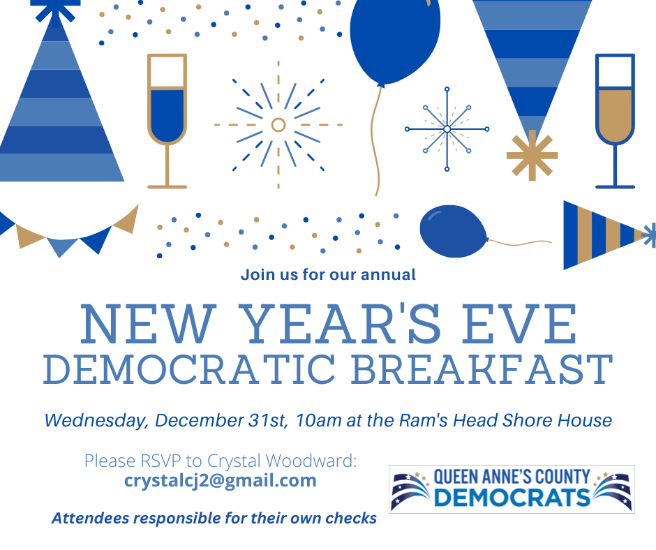 Join your fellow democrats for the Annual New Year's Eve Democratic breakfast at Ram's Head Shore House! We'll be gathering at 10am in the back room for Ram's Head's delicious breakfast and brunch options.
