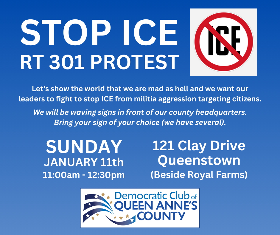 If you are as angry as your Democratic Club board members are, then you agree that we can’t be quiet. Let’s show the world (or at least the Rt 301 traffic) that we are mad as hell and we want our leaders to fight to stop ICE from militia aggression targeting citizens and the clown-in-chief from feeding his ego with imperialism and dictatorship with no resistance or accountability.