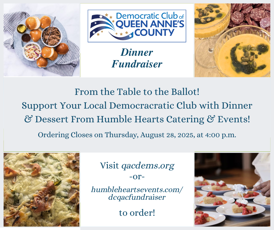 Ordering Closes on Thursday, August 28, 2025, at 4:00 p.m. Pickup will be on Tuesday, September 2nd between 4:30 pm- 6:30pm at the QAC Democratic party headquarters, 121 Clay Drive, Queenstown, MD 21658.